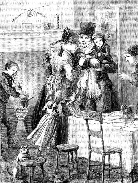 The illustrator subtly communicates the Cratchits’ lower-class status: