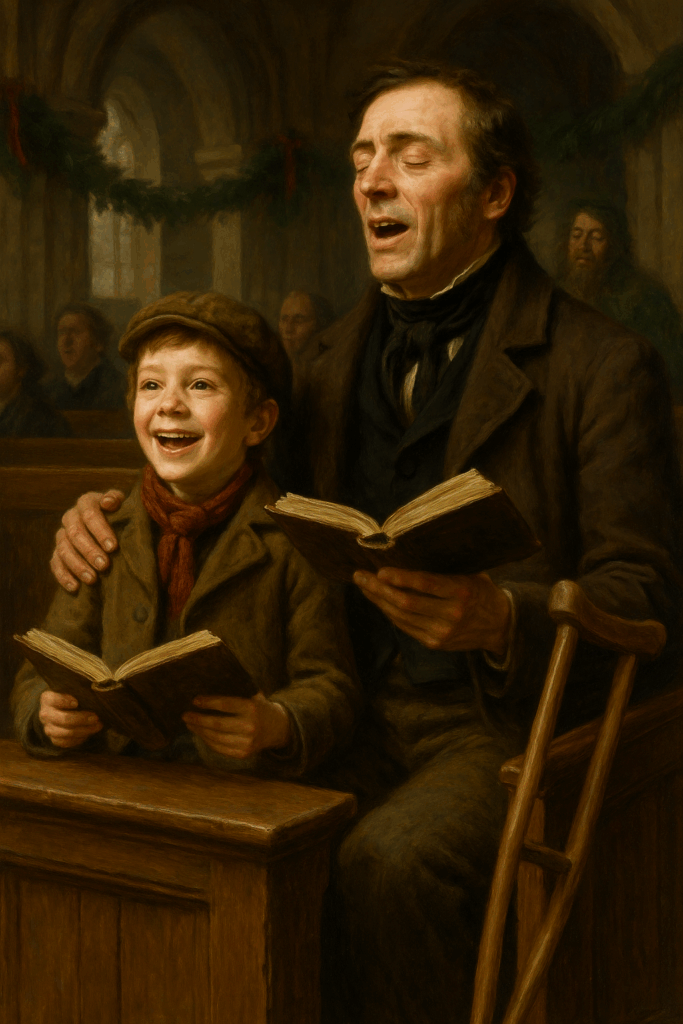 The overall tone is unmistakably jubilant and worshipful. Tiny Tim’s open-mouthed smile and bright eyes express pure childhood delight, not merely in the act of singing, but perhaps in the spiritual joy of the season itself. Bob’s expression, by contrast, is more mature—part pride, part reverence, part gratitude—as though he is overwhelmed by the moment of grace unfolding beside him.