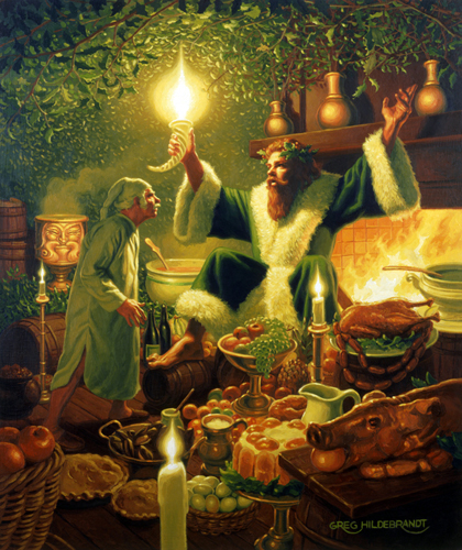 The artist uses an intensified palette—greens, golds, deep browns—to create a setting overflowing with sensory richness. The Ghost’s robe, a deep emerald trimmed with thick white fur, immediately conveys warmth, festivity, and good cheer. His auburn hair and beard glow with the firelight, blending perfectly with the golds of the room and the torch.