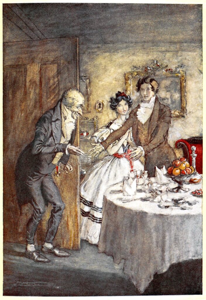 Rackham’s composition guides the viewer’s eye from the dark doorway → to Fred’s gesture → to the glowing celebration.